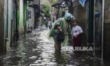 Warga berjalan melewati banjir di Gang Langgar, Petogogan, Kebayoran Baru, Jakarta, Senin (7/11/2022). Banjir di kawasan pemukiman warga setinggi 30 sentimeter tersebut diakibatkan hujan deras yang mengguyur Jakarta sehingga membuat aliran air Kali Krukut meluap. Republika/Putra M. Akbar (FOTO : Republika/Putra M. Akbar)