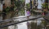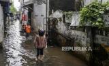 Seorang anak berjalan melewati banjir di Gang Langgar, Petogogan, Kebayoran Baru, Jakarta, Senin (7/11/2022). Banjir di kawasan pemukiman warga setinggi 30 sentimeter tersebut diakibatkan hujan deras yang mengguyur Jakarta sehingga membuat aliran air Kali Krukut meluap. Republika/Putra M. Akbar (FOTO : Republika/Putra M. Akbar)
