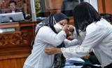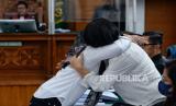 Saksi asisten rumah tangga (ART) Susi (kiri) memeluk terdakwa kasus dugaan pembunuhan berencana terhadap Brigadir Nofriansyah Yosua Hutabarat, Putri Candrawathi (kanan) saat sebelum memberikan keterangan saksi dalam sidang lanjutan di Pengadilan Negeri Jakarta Selatan, Jakarta, Selasa (8/11/2022). (FOTO : Republika/Thoudy Badai)