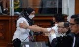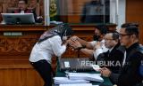 Saksi asisten rumah tangga (ART) Susi (kiri) menghampiri terdakwa kasus dugaan pembunuhan berencana terhadap Brigadir Nofriansyah Yosua Hutabarat, Ferdy Sambo saat sebelum memberikan keterangan saksi dalam sidang lanjutan di Pengadilan Negeri Jakarta Selatan, Jakarta, Selasa (8/11/2022). (FOTO : Republika/Thoudy Badai)
