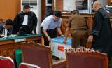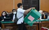 Petugas membawa barang bukti saat sidang lanjutan terdakwa kasus dugaan pembunuhan berencana terhadap Brigadir Nofriansyah Yosua Hutabarat, Ferdy Sambo dan Putri Candrawathi di Pengadilan Negeri Jakarta Selatan, Jakarta, Selasa (8/11/2022). Jaksa penuntut umum (JPU) kembali menghadirkan asisten rumah tangga Ferdy Sambo dan Putri Candrawathi, Susi bersama 9 orang lainnya untuk dimintai keterangan saksi dalam sidang perkara dugaan pembunuhan berencana terhadap Brigadir J. Republika/Thoudy Badai (FOTO : Republika/Thoudy Badai)