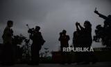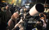 Warga mengamati posisi gerhana bulan total di area Taman Ismail Marzuki, Jakarta, Selasa (8/11/2022). Menurut Badan Riset dan Inovasi Nasional (BRIN) gerhana bulan total berlangsung pada pukul 18.00 WIB sementara untuk proses gerhana bulan secara keseluruhan berlangsung selama 3 jam, 39 menit, dan 50 detik. Namun fenomena gerhana bulan tersebut tidak dapat dilihat secara langsung di Jakarta akibat hujan. Republika/Thoudy Badai (FOTO : Republika/Thoudy Badai)