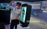 Tamu undangan mengamati produk Proto M Hologram saat peluncurannya di House of Future, Plaza Indonesia, Jakarta, Selasa (8/11/2022). V2 Indonesia perusahan yang berfokus pada solusi audio visual dan keuggulan teknologi masa depan menghadirkan Proto M, perangkat komunikasi dan Media Holografik meja pertama di dunia dan menciptakan pengalaman video volumetrik yang realistis dalam resolusi 4K, yang dapat digunakan dalam kegiatan bisnis, pendidikan, hiburan, kesehatan, ritel, dan telekomunikasi. (FOTO : Republika/Prayogi)