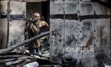 REPUBLIKA.CO.ID, BANDUNG -- Petugas keamanan melintas di depan deretan kios pascakebakaran di Pasar Induk Caringin, Kota Bandung, Kamis (10/11/2022).