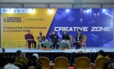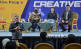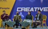 Penulis Buku (Bukan) Kisah Sukses Erick Thohir Abdullah Sammy (kiri) menyampaikan paparan bersama narasumber Ekonom Dradjad Wibowo (dua kiri), Mantan Pebulu Tangkis Nasional Greysia Polii (dua kanan) dan Moderator Pangeran Siahaan (kanan) dalam peluncuran buku biografi berjudul (Bukan) Kisah Sukses Erick Thohir di Indonesia International Book Fair, JCC, Senayan , Jakarta, Kamis (10/11/2022). Pelucuran buku setebal sekitar 160 halaman tersebut dihadiri oleh sejumlah pejabat publik, atlet hingga para direksi BUMN. Buku ini menceritakan perjalanan hidup Erick Thohir sejak bangku sekolah hingga sekarang menjabat sebagai menteri BUMN. Republika/Prayogi. (FOTO : Republika/Prayogi)