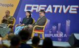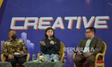 Mantan Pebulu Tangkis Nasional Greysia Polii (tengah)menyampaikan paparan bersama narasumber Ekonom Dradjad Wibowo (kiri) dan Moderator Pangeran Siahaan (kanan) dalam peluncuran buku biografi berjudul (Bukan) Kisah Sukses Erick Thohir di Indonesia International Book Fair, JCC, Senayan , Jakarta, Kamis (10/11/2022). Pelucuran buku setebal sekitar 160 halaman tersebut dihadiri oleh sejumlah pejabat publik, atlet hingga para direksi BUMN. Buku ini menceritakan perjalanan hidup Erick Thohir sejak bangku sekolah hingga sekarang menjabat sebagai menteri BUMN. Republika/Prayogi. (FOTO : Republika/Prayogi)