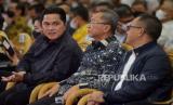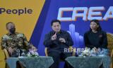 Menteri BUMN Erick Thohir (tengah) memberikan sambutan bersama dengan narasumber Ekonom Dradjad Wibowo (kiri) dan Mantan Pebulu Tangkis Nasional Greysia Polii ( kanan) dalam peluncuran buku biografi berjudul (Bukan) Kisah Sukses Erick Thohir di Indonesia International Book Fair (IIBF) 2022, JCC, Senayan , Jakarta, Kamis (10/11/2022). Pelucuran buku setebal sekitar 160 halaman tersebut dihadiri oleh sejumlah pejabat publik, atlet hingga para direksi BUMN. Buku ini menceritakan perjalanan hidup Erick Thohir sejak bangku sekolah hingga sekarang menjabat sebagai menteri BUMN. Republika/Prayogi. (FOTO : Republika/Prayogi)