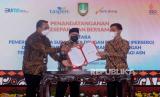 REPUBLIKA.CO.ID, SOLO -- Direktur utama PT TASPEN (Persero) Antonius Nicholas Stephanus Kosasih bersama Wali Kota Solo Gibran Rakabuming Raka (dan Direktur Bisnis dan Dana Jasa Usaha Mikro Kecil Menengah (UMKM) Bank Jateng Irianto Harko Saputro menunjukkan berkas penandatangan MOU Hunian untuk Aparatur Sipil Negara (ASN) Pemkot Solo di Balai Kota Solo, Jawa Tengah, Kamis (10/11/2022).