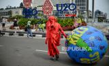 Aktivis lingkungan yang tergabung dalam Extinction Rebellion Indonesia (XR) melakukan aksi saat Hari Bebas Kendaraan Bermotor (HBKB) di kawasan Bundaran Hotel Indonesia, Jakarta, Ahad (13/11/2022). Mereka menuntut kepedulian negara-negara peserta Konferensi Tingkat Tinggi (KTT) G20 untuk melakukan transisi energi yang berkelanjutan dan berkeadilan. Hal ini sebagai upaya mengatasi krisis iklim serta menemukan solusi bersama atas kondisi ekonomi global. (FOTO : Republika/Thoudy Badai)