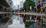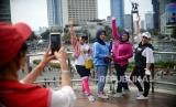 Warga berfoto di Anjungan Halte Bundaran HI saat Hari Bebas Kendaraan Bermotor (HBKB) di kawasan Bundaran Hotel Indonesia, Jakarta, Ahad (13/11/2022). Pemerintah kembali memperpanjang masa pemberlakuan pembatasan kegiatan masyarakat (PPKM) level 1 Jawa-Bali selama 2 pekan, mulai 8 November hingga 21 November seiring dengan jumlah lonjakan kasus harian Covid-19 yang mengalami peningkatan selama sepekan terakhir hingga 5000 kasus aktif, serta mengimbau masyarakat untuk tetap menerapkan protokol kesehatan yang ketat. (FOTO : Republika/Thoudy Badai)