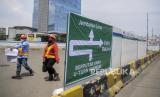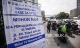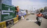 REPUBLIKA.CO.ID,JAKARTA -- Pekerja memasang spanduk sosialisasi pengalihan arus lalu lintas di Jalan Gajah Mada, Jakarta, Senin (14/11/2022).