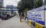 Pekerja memasang spanduk sosialisasi pengalihan arus lalu lintas di Jalan Gajah Mada, Jakarta, Senin (14/11/2022). Simpang Gajah Mada Plaza atau persimpangan antara Jalan Gajah Mada, Jalan Hayam Wuruk, Jalan Sukarjo Wiryopranoto dan Jalan KH Zainul Arifin, ditutup karena ada pengerjaan konstruksi CP202 MRT Jakarta Fase 2A. (FOTO : Republika)