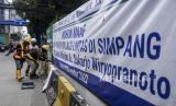 Pekerja memasang spanduk sosialisasi pengalihan arus lalu lintas di Jalan Gajah Mada, Jakarta, Senin (14/11/2022). Simpang Gajah Mada Plaza atau persimpangan antara Jalan Gajah Mada, Jalan Hayam Wuruk, Jalan Sukarjo Wiryopranoto dan Jalan KH Zainul Arifin, ditutup karena ada pengerjaan konstruksi CP202 MRT Jakarta Fase 2A. Republika/Putra M. Akbar (FOTO : Republika)
