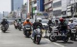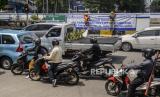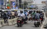 Pengendara motor melawan arus untuk berputar balik saat diberlakukannya pengalihan arus lalu lintas di Jalan Gajah Mada, Jakarta, Senin (14/11/2022). Simpang Gajah Mada Plaza atau persimpangan antara Jalan Gajah Mada, Jalan Hayam Wuruk, Jalan Sukarjo Wiryopranoto dan Jalan KH Zainul Arifin, ditutup karena ada pengerjaan konstruksi CP202 MRT Jakarta Fase 2A. Republika/Putra M. Akbar (FOTO : Republika/Putra M. Akbar)
