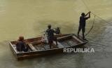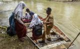Warga terpaksa menggunakan perahu tarik untuk menyeberangi sungai. .