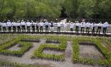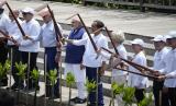 Pimpinan mengangkat cangkul kebun untuk foto bersama dalam acara penanaman pohon di Hutan Mangrove Taman Hutan Raya Ngurah Rai, di sela-sela pertemuan KTT G20, Rabu, 16 November 2022, di Denpasar, Bali, Indonesia. (FOTO : AP/Alex Brandon)