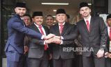Pesepak bola Sandy Walsh (kanan) dan Jordi Amat (kiri) bersama Ketua Umum PSSI Mochamad Iriawan (kedua kanan) dan Kepala Kanwil Kemenkumham DKI Jakarta Ibnu Chuldun (kedua kiri) saling berpegangan tangan usai membacakan Sumpah Janji Setia Pewarganegaraan di Kantor Wilayah Kemenkum HAM DKI Jakarta, Kamis (17/11/2022). Pesepak bola naturalisasi asal Belanda, Sandy Walsh dan pesepak bola naturalisasi asal Spanyol, Jordi Amat resmi menjadi Warga Negara Indonesia (WNI) setelah prosesi pengucapan sumpah yang kemudian berpeluang untuk membela Timnas Indonesia di Piala AFF 2022 pada Desember mendatang. ANTARA FOTO/Hafidz Mubarak A/foc. (FOTO : ANTARA FOTO/Hafidz Mubarak A)