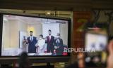 REPUBLIKA.CO.ID, JAKARTA -- Layar menampilkan pesepak bola Sandy Walsh dan Jordi Amat membacakan Sumpah Janji Setia Pewarganegaraan di Kantor Wilayah Kemenkum HAM DKI Jakarta, Kamis (17/11/2022).