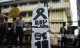 Poster berisi tuntutan atas Tragedi Kanjuruhan dipasang di pohon saat aksi di depan Mabes Polri, Jakarta, Sabtu (19/11/2022). Dalam aksinya, keluarga korban dan Aremania mendesak pihak kepolisian untuk segera menuntaskan kasus dugaan penganiayaan serta meminta kejelasan atas pelaporan yang diajukan keluarga korban dalam Tragedi Kanjuruhan yang menyebabkan sebanyak 135 korban jiwa. Republika/Thoudy Badai (FOTO : Republika/Thoudy Badai)