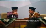 Ketua Umum PP Muhammadiyah terpilih Haedar Nashir (kiri) berbincang bersama Panitia Pemilihan Dahlan Rais saat Sidang Pleno VIII Muktamar ke-48 Muhammadiyah di Edutorium UMS, Surakarta, Jawa Tengah, Ahad (20/11/2022). Pada Sidang Pleno VIII menetapkan Haedar Nashir kembali menjadi Ketua Umum PP Muhammadiyah periode 2022 - 2027. Sedangkan Sekertaris Umum PP Muhammadiyah juga kembali dijabat Abdul Muti. (FOTO : Republika/Wihdan Hidayat)