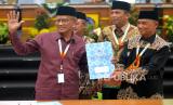 Ketua Umum PP Muhammadiyah (tengah) berdiri saat terpilih kembali menjadi ketua umum pada Sidang Pleno VIII Muktamar ke-48 Muhammadiyah di Edutorium UMS, Surakarta, Jawa Tengah, Ahad (20/11/2022). Pada Sidang Pleno VIII menetapkan Haedar Nashir kembali menjadi Ketua Umum PP Muhammadiyah periode 2022 - 2027. Sedangkan Sekertaris Umum PP Muhammadiyah juga kembali dijabat Abdul Muti. (FOTO : Republika/Wihdan Hidayat)