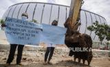 Warga berunjuk rasa di depan gerbang Kampung Susun Bayam, Pademangan, Jakarta Utara, Senin (21/11/2022). Aksi tersebut dilakukan untuk menagih janji PT Jakpro dan Pemprov DKI Jakarta agar warga bisa segera menempati Kampung Susun Bayam secepatnya. Berdasarkan kesepakatan seharusnya wagra sudah mulai bisa menempati hunian pada Ahad (20/11/2022) kemarin. Republika/Putra M. Akbar (FOTO : Republika/Putra M. Akbar)