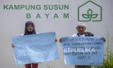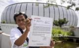 Warga menunjukan surat pemberitahuan saat berunjuk rasa di depan gerbang Kampung Susun Bayam, Pademangan, Jakarta Utara, Senin (21/11/2022). Aksi tersebut dilakukan untuk menagih janji PT Jakpro dan Pemprov DKI Jakarta agar warga bisa segera menempati Kampung Susun Bayam secepatnya. Berdasarkan kesepakatan seharusnya wagra sudah mulai bisa menempati hunian pada Ahad (20/11/2022) kemarin. Republika/Putra M. Akbar (FOTO : Republika/Putra M. Akbar)