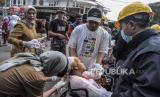 Warga bersama petugas merawat pasien pasca gempa bumi di halaman RSUD Cianjur, Jalan Pasirgede Raya, Kabupaten Cianjur, Senin (21/11/2022). Berdasarkan keterangan Badan Nasional Penanggulangan Bencana (BNPB) total saat ini korban meninggal dunia mencapai 46 orang dan 700 korban terluka pasca gempa bumi 5,6 SR di Kabupaten Cianjur. (FOTO : ABDAN SYAKURA/REPUBLIKA)