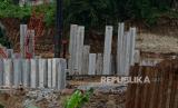 Pekerja menyelesaikan proyek Pembangunan Sistem Pengambilan dan Treatment Sampah Badan Air melalui Rekayasa Sungai pada Kali Ciliwung segmen TB Simatupang di kawasan Kampung Gedong, Pasar Rebo, Jakarta Selatan, Rabu (23/11/2022). Proyek pembangunan tersebut berfungsi untuk menyaring dan menampung sampah dari aliran Kali Ciliwung guna mengurangi beban sampah di Pintu Air Manggarai. Pembangunan penyaringan sampah tersebut nantinya diharapkan mampu menghentikan aliran sampah yang masuk ke DKI Jakarta sebagai upaya mengatasi masalah banjir. Proyek tersebut menghabiskan dana sebesar Rp197,21 miliar yang dianggarkan dalam APBD tahun 2022 dengan target akan rampung pada Desember 2022 ini. Republika/Thoudy Badai (FOTO : Republika/Thoudy Badai)