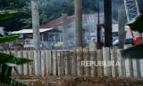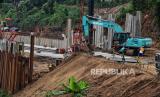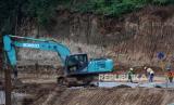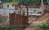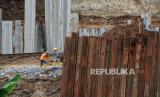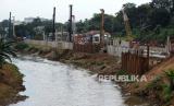 Pekerja menyelesaikan proyek Pembangunan Sistem Pengambilan dan Treatment Sampah Badan Air melalui Rekayasa Sungai pada Kali Ciliwung segmen TB Simatupang di kawasan Kampung Gedong, Pasar Rebo, Jakarta Selatan, Rabu (23/11/2022). Proyek pembangunan tersebut berfungsi untuk menyaring dan menampung sampah dari aliran Kali Ciliwung guna mengurangi beban sampah di Pintu Air Manggarai. Pembangunan penyaringan sampah tersebut nantinya diharapkan mampu menghentikan aliran sampah yang masuk ke DKI Jakarta sebagai upaya mengatasi masalah banjir. Proyek tersebut menghabiskan dana sebesar Rp197,21 miliar yang dianggarkan dalam APBD tahun 2022 dengan target akan rampung pada Desember 2022 ini. (FOTO : Republika/Thoudy Badai)