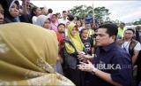 Menteri BUMN Erick Thohir berbicara dengan warga saat meninjau posko utama Satgas Bencana BUMN di Perhutani KPH Cianjur, dan beberapa titik gempa di sekitar Limbangan Sari, Cianjur, Jumat (25/11/2022). (FOTO : Kementerian BUMN)