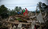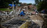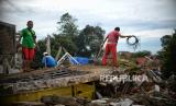 Pengungsi membongkar atap rumah yang roboh akibat gempa di Desa Gasol, Kecamatan Cugenang, Kabupaten Cianjur, Jawa Barat, Jumat (25/11/2022). Pemerintah memastikan akan menyalurkan bantuan dana kepada warga yang rumahnya mengalami kerusakan akibat gempa. Bantuan tersebut dibagi menjadi tiga jenis, untuk kerusakan berat akan mendapatkan bantuan sebesar Rp50 juta, kerusakan sedang Rp25 juta dan kerusakan ringan Rp10 juta. Republika/Thoudy Badai (FOTO : Republika/Thoudy Badai)