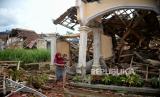 Pengungsi berjalan di depan bangunan yang roboh akibat gempa di Desa Gasol, Kecamatan Cugenang, Kabupaten Cianjur, Jawa Barat, Jumat (25/11/2022). Pemerintah memastikan akan menyalurkan bantuan dana kepada warga yang rumahnya mengalami kerusakan akibat gempa. Bantuan tersebut dibagi menjadi tiga jenis, untuk kerusakan berat akan mendapatkan bantuan sebesar Rp50 juta, kerusakan sedang Rp25 juta dan kerusakan ringan Rp10 juta. Republika/Thoudy Badai (FOTO : Republika/Thoudy Badai)