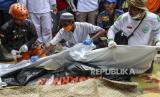 Para relawan menangani jenazah seorang gadis berusia tujuh tahun yang tewas dalam gempa Senin untuk dimakamkan, di Cianjur, Jawa Barat, Jumat (25/11/2022). Gempa berkekuatan 5,6 SR itu menewaskan ratusan orang, banyak di antaranya anak-anak , dan melukai ribuan orang. (FOTO : AP/Garry Lotulung)
