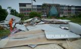 Petugas PPSU mengangkat puing-puing rumah yang terbawa angin puting beliung di Kawasan Jelambar, Grogol Petamburan, Jakarta, Ahad (27/11/2022). Dampak angin puting beliung yang menerjang daerah tersebut mengakibatkan 16 unit kontrakan semi permanen rusak dan sebanyak 68 jiwa harus mengungsi. Tidak ada korban jiwa dalam persistiwa yang terjadi pada Sabtu (26/11/2022) pukul 14.30 tersebut. Republika/Prayogi (FOTO : Republika/Prayogi)