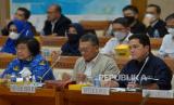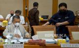REPUBLIKA.CO.ID,JAKARTA -- Menteri ESDM Arifin Tasrif, Menteri BUMN Erick Thohir dan Menteri LHK Siti Nurbaya mengikuti Rapat Kerja dengan Komisi VII DPR di kompleks Parlemen Senayan, Jakarta, Selasa (29/11/2022).