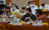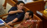 Menteri ESDM Arifin Tasrif (kiri) dan Menteri BUMN Erick Thohir (kanan) saat mengikuti Rapat Kerja dengan Komisi VII di kompleks Parlemen Senayan, Jakarta, Selasa (29/11/2022). Raker tersebut beragendakan pengantar musyawarah mengenai Rancangan Undang-Undang Energi Baru dan Energi Terbarukan (RUU EB-ET). Republika/Prayogi (FOTO : Republika/Prayogi)