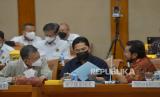Menteri ESDM Arifin Tasrif (tengah), Menteri BUMN Erick Thohir (kanan) dan Menteri LHK Siti Nurbaya (kiri) mengikuti Rapat Kerja dengan Komisi VII di kompleks Parlemen Senayan, Jakarta, Selasa (29/11/2022). Raker tersebut beragendakan pengantar musyawarah mengenai Rancangan Undang-Undang Energi Baru dan Energi Terbarukan (RUU EB-ET). (FOTO : Republika/Prayogi)