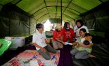 Community Investment Senior Manager Prudential Indonesia Nuranisa Putri Matahari, (kanan) berbincang dengan salah satu korban di tenda pengungsi sementara gempa Cianjur di Kampung Barukaso, Desa Sukamulya, Kec. Cugenang, Cianjur, Ahad (27/11/2022). (FOTO : Dok Prudential)