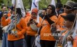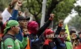 Massa buruh saat melaksanakan aksi di depan Balai Kota DKI Jakarta, Jumat (2/12/2022). Pada aksi tersebut mereka menuntut meminta UMP DKI 2023 naik 10,55 persen, menolak kenaikan UMP DKI 2023 yang naik sebesar 5,6 persen atau Rp 4,9 juta, meminta inflasi dan pertumbuhan ekonomi jadi acuan penetapan UMP 2023 dan menolak UU Cipta Kerja. (FOTO : Republika/Putra M. Akbar)
