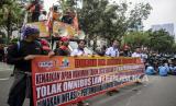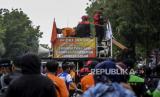 Massa buruh mendorong motor saat melaksanakan aksi di depan Balai Kota DKI Jakarta, Jumat (2/12/2022). Pada aksi tersebut mereka menuntut meminta UMP DKI 2023 naik 10,55 persen, menolak kenaikan UMP DKI 2023 yang naik sebesar 5,6 persen atau Rp 4,9 juta, meminta inflasi dan pertumbuhan ekonomi jadi acuan penetapan UMP 2023 dan menolak UU Cipta Kerja. Republika/Putra M. Akbar (FOTO : Republika/Putra M. Akbar)