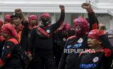 REPUBLIKA.CO.ID,JAKARTA -- Massa buruh saat melaksanakan aksi di depan Balai Kota DKI Jakarta, Jumat (2/12/2022).