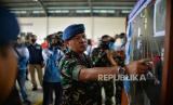 Panglima Komando Operasi Udara (Pangkoopsud) I Marsda TNI Bambang Gunarto (tengah) meninjau paket bantuan korban gempa di Posko Satgasduk Operasi Murai Sakti 22 di Lanud Atang Sendjaja, Bogor, Jawa Barat, Jumat (2/12/2022). Selain menyerahkan secara simbolis bantuan melalui posko Satgasduk Operasi Murai Sakti 22, Panglima Komando Operasi Udara (koopsud) I Marsda TNI Bambang Gunarto juga meninjau kondisi posko serta peta lokasi bencana dan jumlah data penyaluran bantuan untuk korban gempa Cianjur. Sebanyak 57 ton berisi paket sembako diserahkan Koopsud I melalui posko Satgasduk yang nantinya akan disalurkan kepada warga terdampak menggunakan jalur udara untuk mempercepat penyaluran bantuan juga mampu mengakses wilayah yang terisolir. Republika/Thoudy Badai (FOTO : Republika/Thoudy Badai)