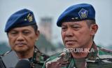 Panglima Komando Operasi Udara (Pangkoopsud) I Marsda TNI Bambang Gunarto (kanan) menjawab pertanyaan jurnalis usai meninjau penyaluran bantuan korban gempa Cianjur di Posko Satgasduk Operasi Murai Sakti 22 di Lanud Atang Sendjaja, Bogor, Jawa Barat, Jumat (2/12/2022). Selain menyerahkan secara simbolis bantuan melalui posko Satgasduk Operasi Murai Sakti 22, Panglima Komando Operasi Udara (koopsud) I Marsda TNI Bambang Gunarto juga meninjau kondisi posko serta peta lokasi bencana dan jumlah data penyaluran bantuan untuk korban gempa Cianjur. Sebanyak 57 ton berisi paket sembako diserahkan Koopsud I melalui posko Satgasduk yang nantinya akan disalurkan kepada warga terdampak menggunakan jalur udara untuk mempercepat penyaluran bantuan juga mampu mengakses wilayah yang terisolir. (FOTO : Republika/Thoudy Badai)
