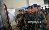 Panglima Komando Operasi Udara (Pangkoopsud) I Marsda TNI Bambang Gunarto mengamati peta bencana Gempa Cianjur Posko Satgasduk Operasi Murai Sakti 22 di Lanud Atang Sendjaja, Bogor, Jawa Barat, Jumat (2/12/2022). Selain menyerahkan secara simbolis bantuan melalui posko Satgasduk Operasi Murai Sakti 22, Panglima Komando Operasi Udara (koopsud) I Marsda TNI Bambang Gunarto juga meninjau kondisi posko serta peta lokasi bencana dan jumlah data penyaluran bantuan untuk korban gempa Cianjur. Sebanyak 57 ton berisi paket sembako diserahkan Koopsud I melalui posko Satgasduk yang nantinya akan disalurkan kepada warga terdampak menggunakan jalur udara untuk mempercepat penyaluran bantuan juga mampu mengakses wilayah yang terisolir. (FOTO : Republika/Thoudy Badai)