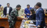 Kepala Staf TNI Angkatan Laut (KSAL) Laksamana Yudo Margono bersalaman dengan Ketua Komisi I DPR Meutya Viada Hafid usai uji kelayakan dan kepatutan calon Panglima TNI di Kompleks Parlemen, Senayan, Jakarta, Jumat (2/12/2022). Rapat internal Komisi I DPR menyetujui Laksamana Yudo Margono sebagai Panglima TNI menggantikan Jenderal Andika Perkasa, setelah yang bersangkutan menjalani rangkaian uji kelayakan dan kepatutan. (FOTO : Republika/Putra M. Akbar)