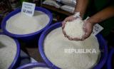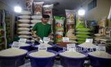 Pedagang menunjukan beras di kawasan Simprug, Jakarta, Jumat (2/12/2022). Badan Pusat statistik menyatakan stok beras surplus 1,7 juta ton dan cukup untuk meemenuhi kebutuhan nasional. (FOTO : Republika/Putra M. Akbar)