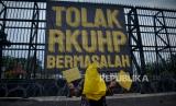 REPUBLIKA.CO.ID, JAKARTA -- Sejumlah orang yang tergabung dalam Aliansi Nasional Reformasi KUHP melakukan aksi di depan Gedung DPR, Jakarta, Senin (5/12/2022). Dalam aksinya mereka menolak atas pengesahan Rancangan Kitab Undang-undang Hukum Pindana (RKUHP) karena menganggap beberapa pasal dalam RKUHP masih bermasalah