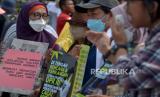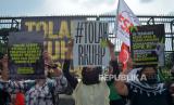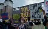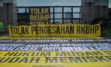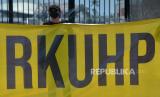 Sejumlah orang yang tergabung dalam Aliansi Nasional Reformasi KUHP melakukan aksi di depan Gedung DPR, Jakarta, Senin (5/12/2022). Dalam aksinya mereka menolak atas pengesahan Rancangan Kitab Undang-undang Hukum Pindana (RKUHP) karena menganggap beberapa pasal dalam RKUHP masih bermasalah.  (FOTO : Republika/Prayogi)
