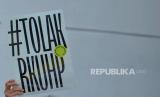 REPUBLIKA.CO.ID, JAKARTA -- Sejumlah orang yang tergabung dalam Aliansi Nasional Reformasi KUHP melakukan aksi di depan Gedung DPR, Jakarta, Senin (5/12/2022). Dalam aksinya mereka menolak atas pengesahan Rancangan Kitab Undang-undang Hukum Pindana (RKUHP) karena menganggap beberapa pasal dalam RKUHP masih bermasalah